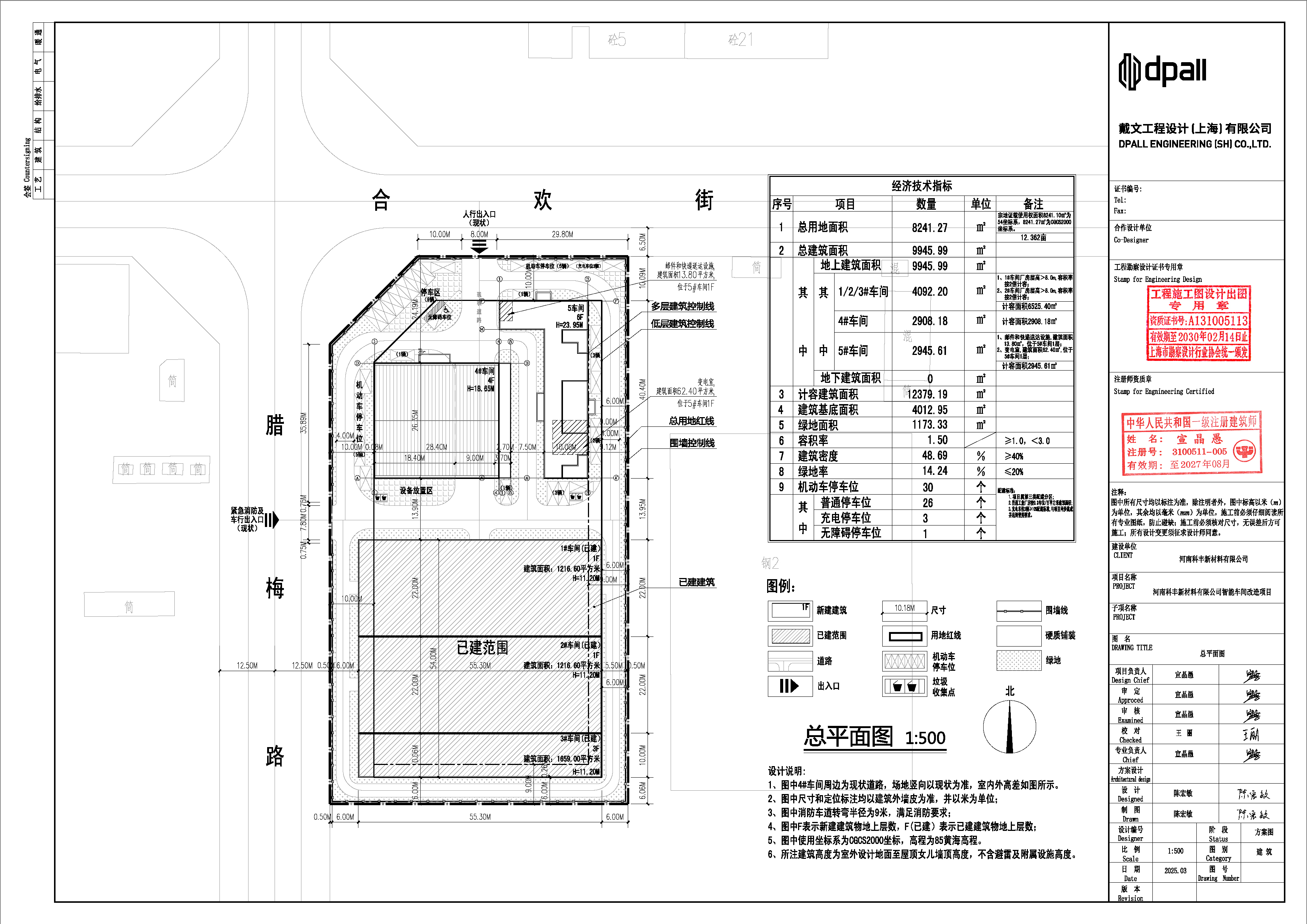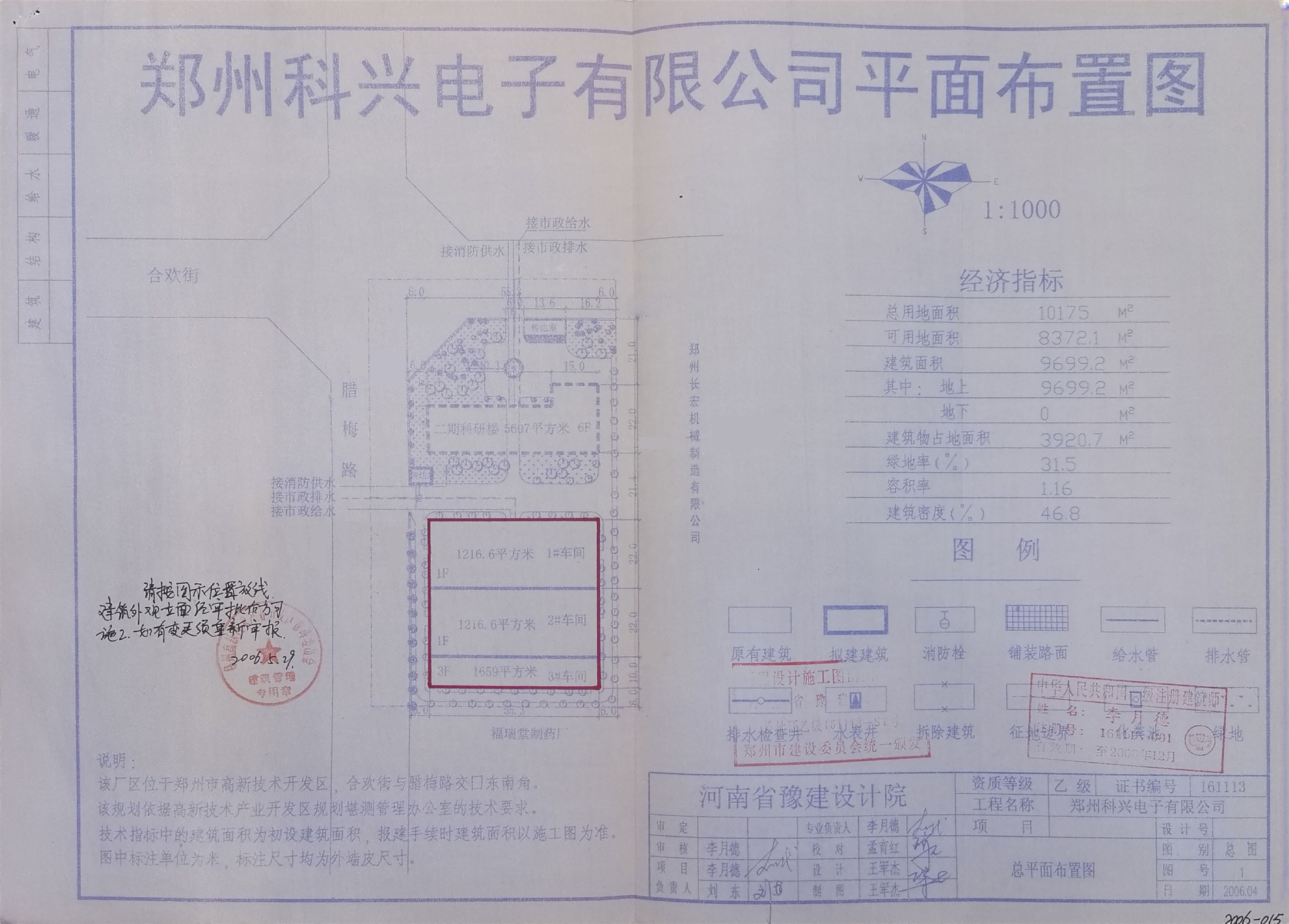 调整内容: | 本次主要调整内容: 1、调整前总建筑面积9699.2㎡,调整后总建筑面积9945.99㎡。 2、调整前容积率1.16,调整后容积率1.50。 3、调整前建筑密度46.8%,调整后建筑密度48.69%。 4、调整前绿地率31.5%,调整后绿地率14.24%。 5、调整前基底面积3920.7㎡,调整后基底面积4012.95㎡。 6、调整后取消北侧、西侧入口两处传达室。 7、调整后取消二期科研楼子项,增加4#车间、5#车间。 |