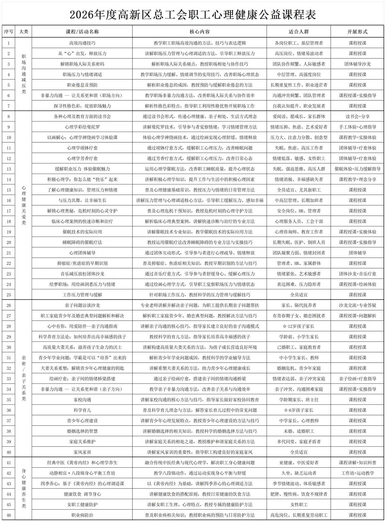 本次公益培训课程覆盖职工工作生活核心需求,既有缓解职场压力的《职场情绪管理与压力疏导》,也有关注家庭幸福的《亲子沟通技巧与家庭教育智慧》,还有助力团队协作的《团队凝聚力与心理资本建设》等。课程由专业心理老师授课,可根据单位需求灵活调整授课时间与内容,确保实用性、针对性拉满。(部分课程详见下图)