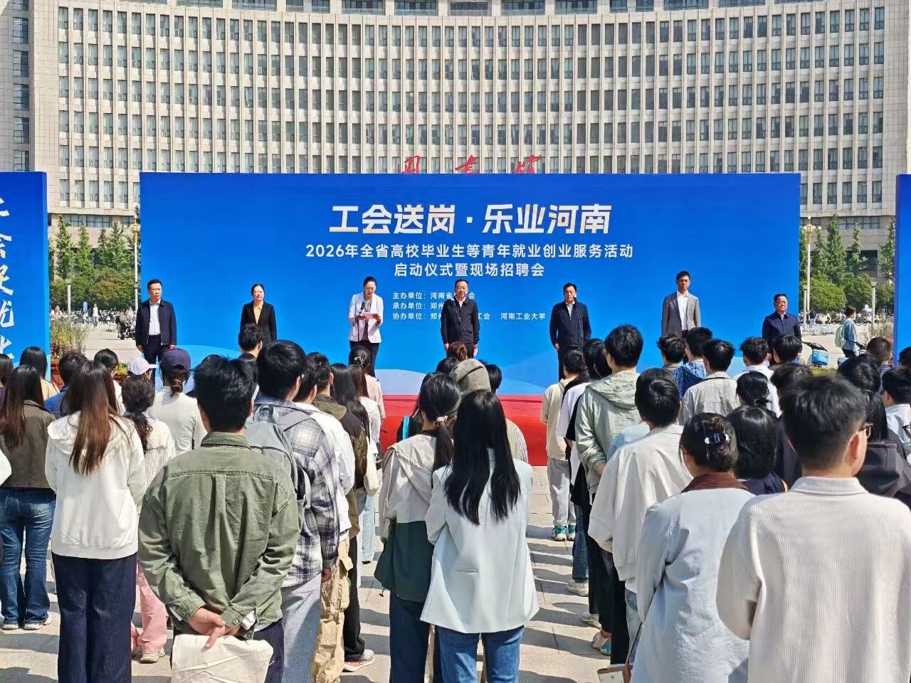 4月23日上午,2026年全省高校毕业生等青年就业创业服务活动启动仪式暨现场招聘会在河南工业大学举行。本次活动由河南省总工会主办,郑州市总工会、高新区总工会、河南工业大学共同承办,以线上线下融合、岗位精准匹配、创业全程赋能为特色,为高校毕业生搭建高效对接平台,用工会温情为青年就业创业保驾护航。