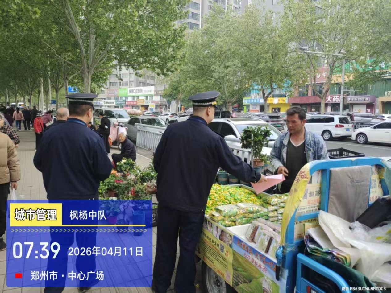 正式规范之前,城市管理部和枫杨办事处做了充分的宣传引导。他们向中心广场附近所有流动摊位经营者发放了《致中心广场早市摊点经营者的公开信》,在信中明确早市设置要求、经营规范和违规处理机制——框定区域雪松路-牡丹路-银杏路-迎春街临中心广场一侧,严禁超区域摆摊;夏季6:00—8:30、冬季6:30—8:30,严格潮汐管理,到点必须收摊;经营品类仅限瓜果蔬菜、日用百货、农副产品,禁止活禽、生肉、水产及现场制作食品。违规处理采取“三明治”式管理:第一次批评教育、现场整改;第二次警告、暂停经营资格;第三次取消经营资格、永久清退。