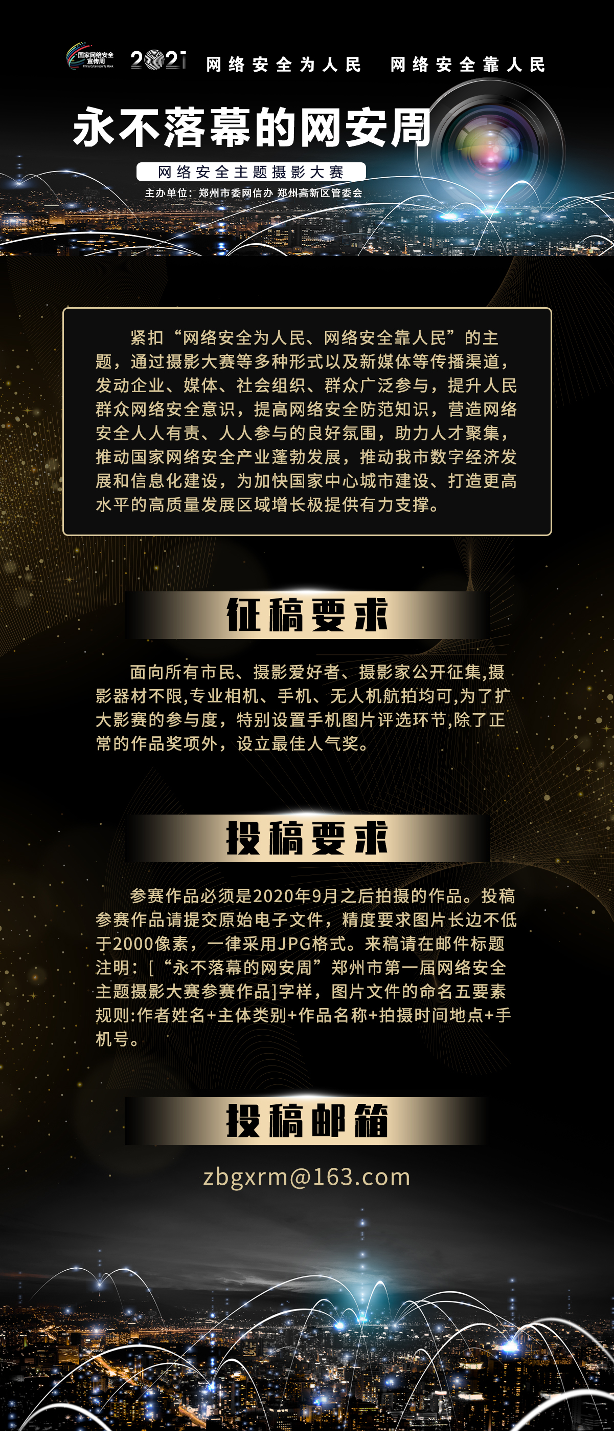 5.投稿参赛作品请提交电子文件,精度要求图片长边不低于2000像素,一律采用jpg格式。作品打包后发送至(zbgxrm@163.com)。来稿请在邮件标题注明:[“永不落幕的网安周”郑州市第一届网络安全主题摄影大赛参赛作品]字样,图片文件的命名五要素规则:作者姓名+主体类别+作品名称+拍摄时间地点+手机号。获奖作品须提供作品的原始电子版,原件逾期不提供者,视为自动放弃奖项。