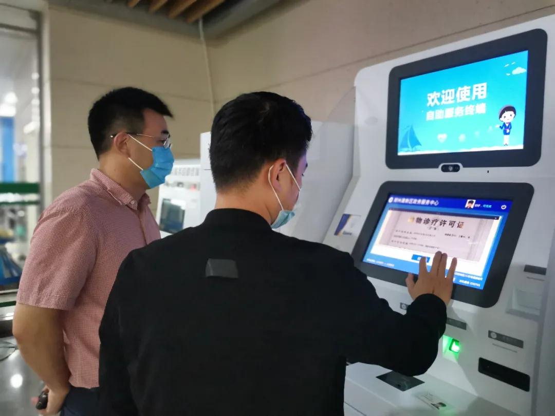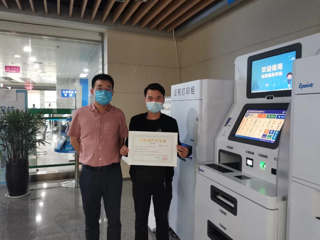 接下来,何威龙拿着身份证到自助服务机打印出证。只见他按照界面操作提示,放置身份证、签字承诺、轻点屏幕上的打印字样后,不到五分钟,一张《动物诊疗经营许可证》正本打印出库。