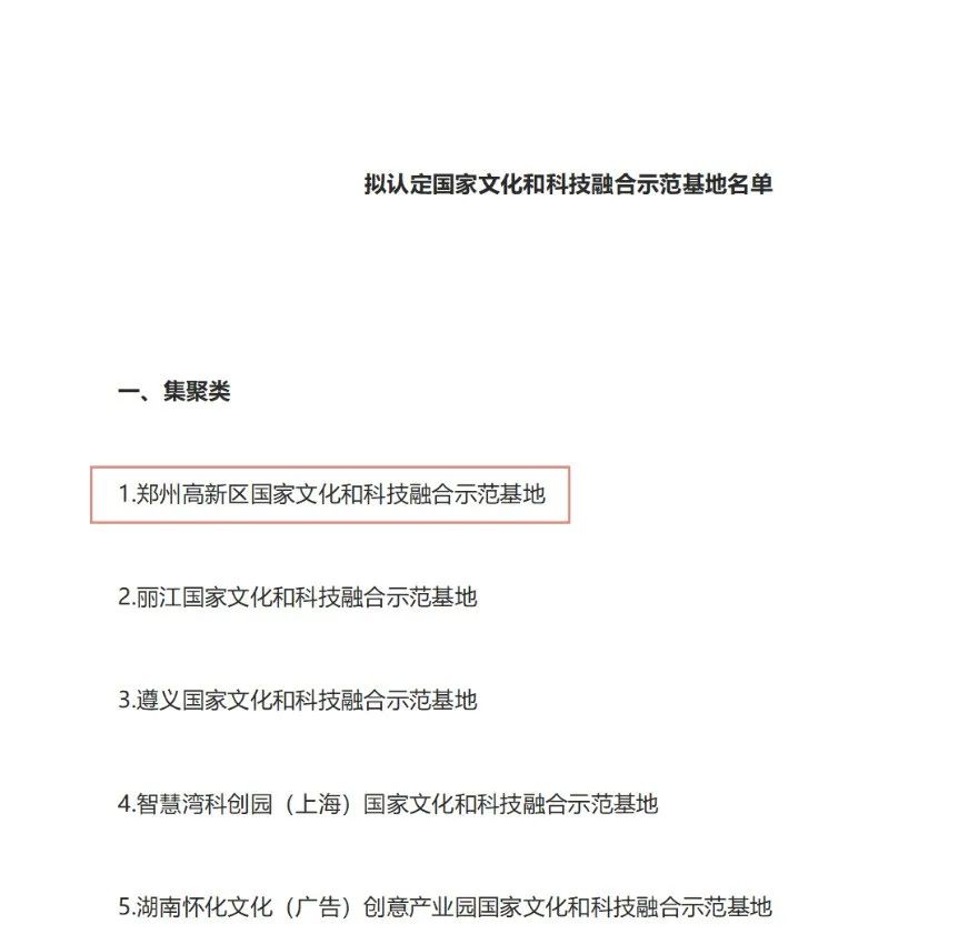 据了解,为着力打造文化和科技深度融合的示范区、政策体系和管理机制先行先试的试验田,科技部、中央宣传部会同中央网信办、文化和旅游部、广电总局启动了第四批国家文化和科技融合示范基地认定工作。本次拟获批的国家文化和科技融合示范基地有30家,其中集聚类基地共5家(入围答辩共12家),郑州高新区综合评分排名第一;单体类25家(入围答辩共36家)。