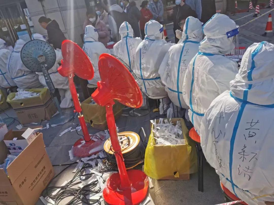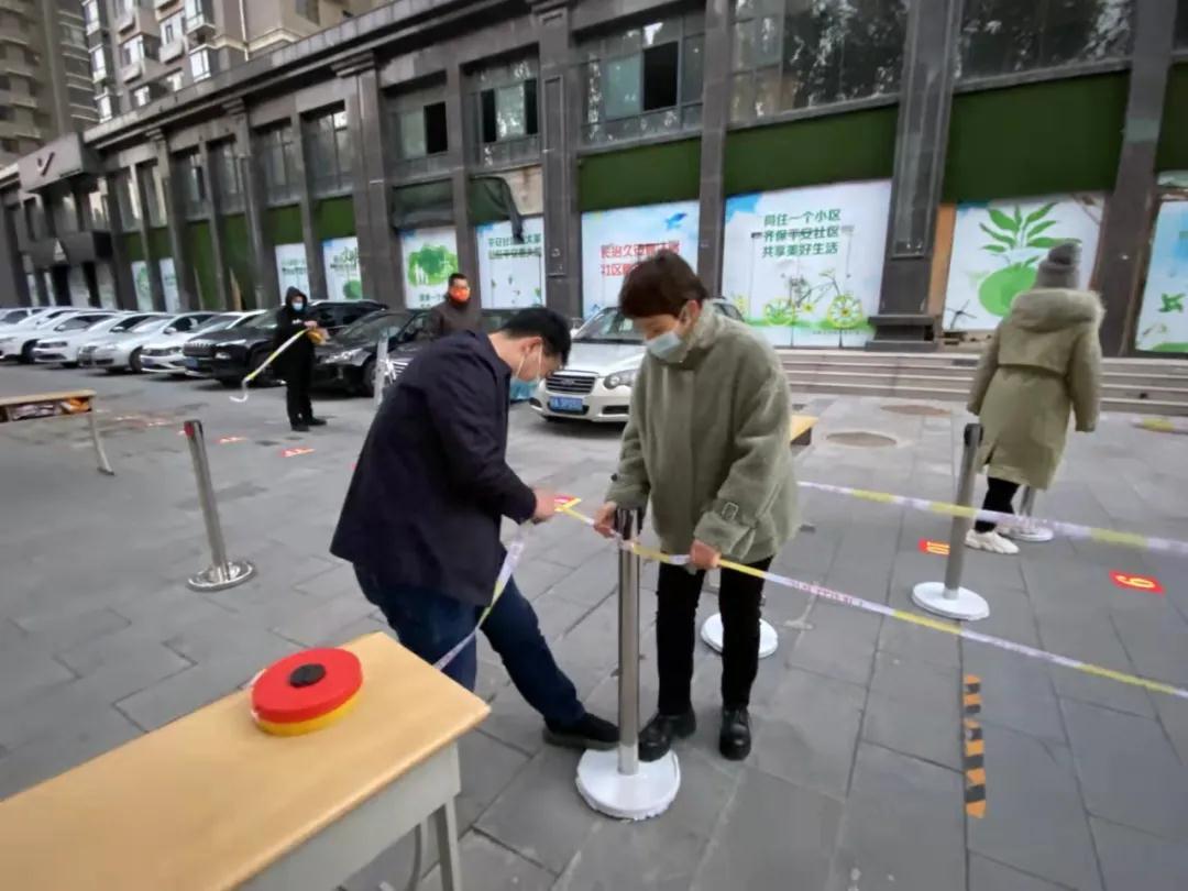 ▲玉兰街社区志愿者用条幅在旁边拉成屏风,为检测人员防风防寒