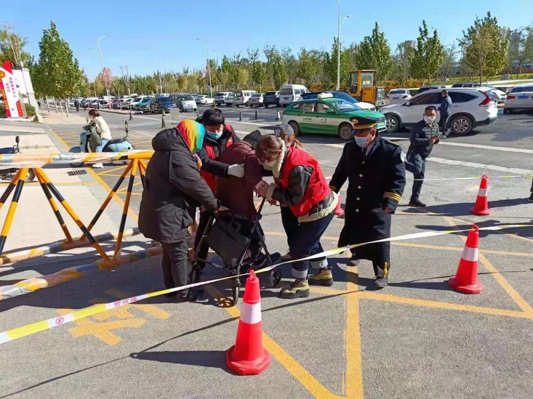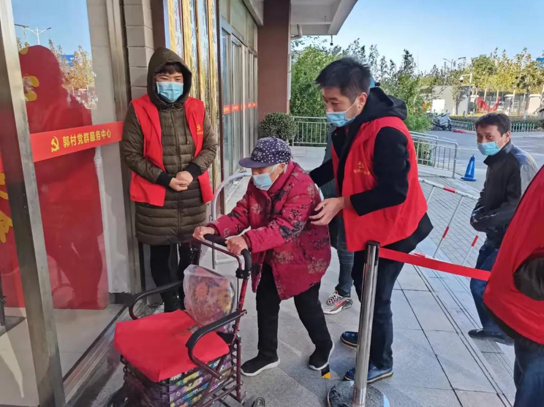 ▲欢河村核酸检测点的志愿者搀扶行动不便的老年人