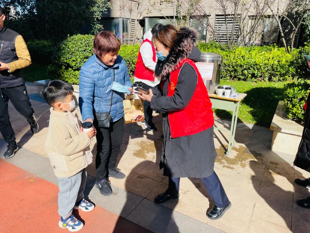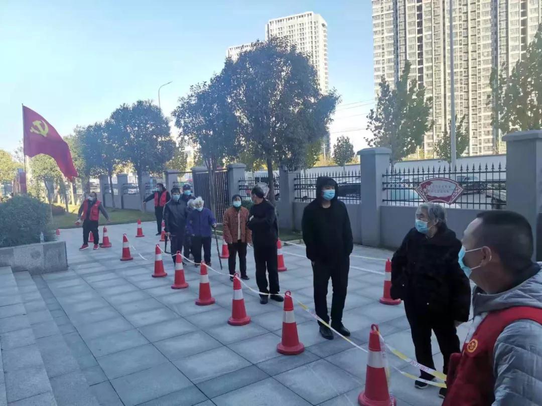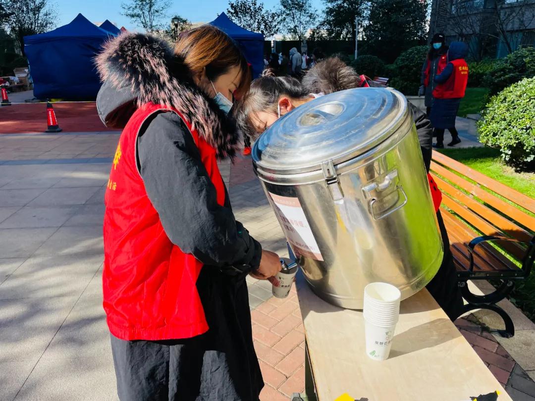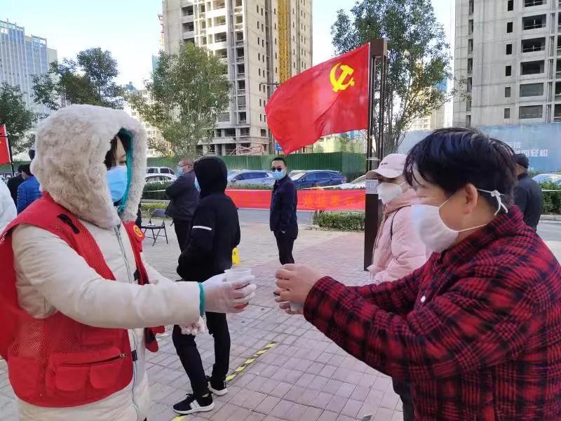 ▲寒冬中,紫薇小区门口的检测点党旗飘扬