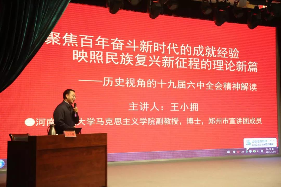 此次宣讲会,邀请郑州市宣讲团成员、河南工业大学马克思主义学院王小拥教授,以《聚焦百年奋斗新时代的成就经验,映照民族复兴新征程的理论新篇——历史视角的十九届六中全会精神解读》为题,阐述了《中共中央关于党的百年奋斗重大成就和历史经验的决议》形成的客观需要和主观条件,讲解了决议的框架结构、重点内容以及党的百年奋斗的历史意义、十个坚持、习近平新时代中国特色社会主义思想的新概括等多个亮点,解读了如何正确理解“两个确立”的决定性意义。