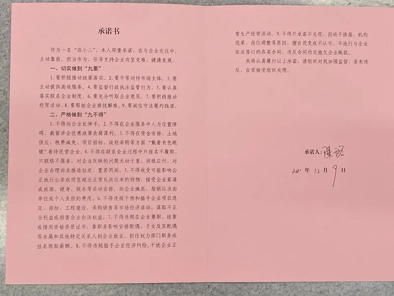 “作为一名‘店小二’,本人郑重承诺,在与企业交往中,主动靠前、担当作为,引导支持企业攻坚克难、健康发展,切实做到‘九要’,严格做到‘九不得’……” 日前,郑州高新区梧桐园区运营中心组织开展构建亲清政商关系廉洁自律承诺书签订仪式,机关干部逐一在承诺书上签下自己的名字。