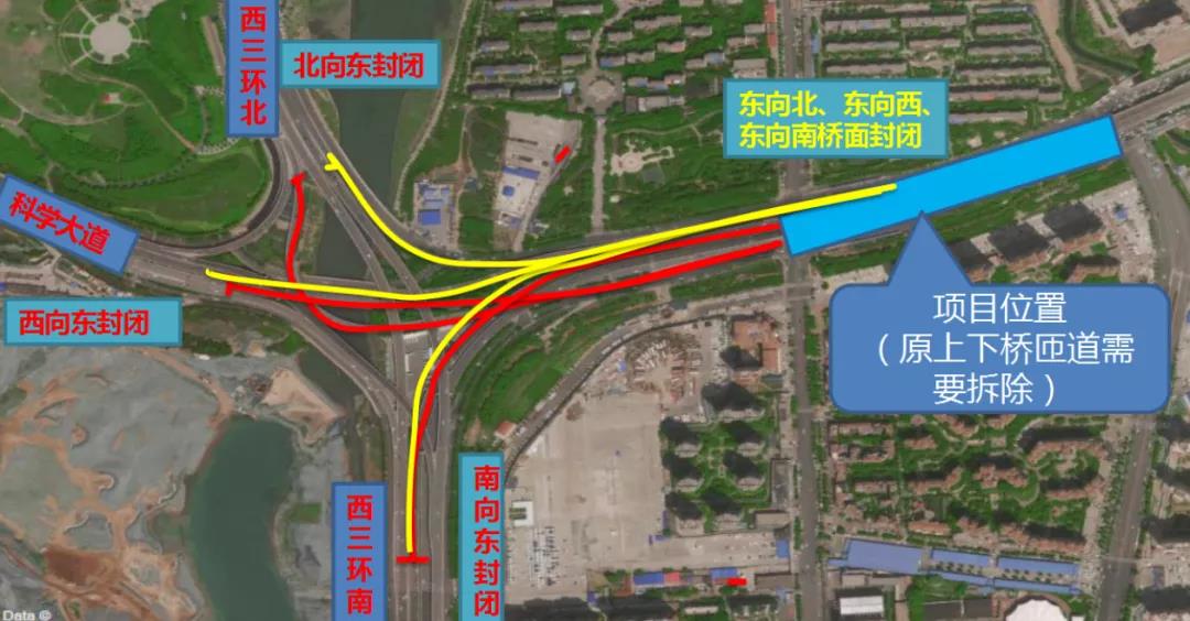 1科学大道西向东方向高架道路封闭,通行车辆可沿科学大道辅道地面层道路向东通行。