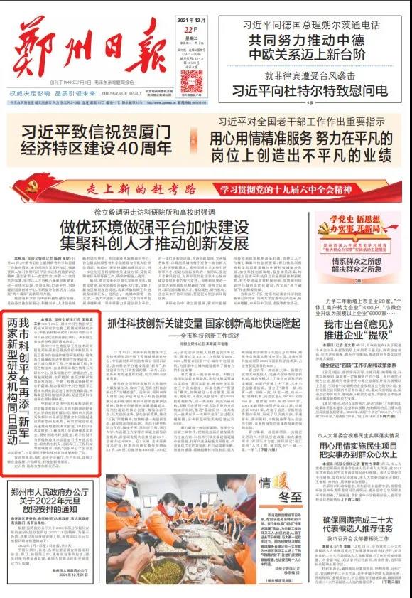 12月21日,郑州中科生物医学工程技术研究院生物工程暨成果转化中心、中机新材料研究院(郑州)有限公司项目启动仪式在高新区举行。市长侯红参加并宣布项目落成启动。