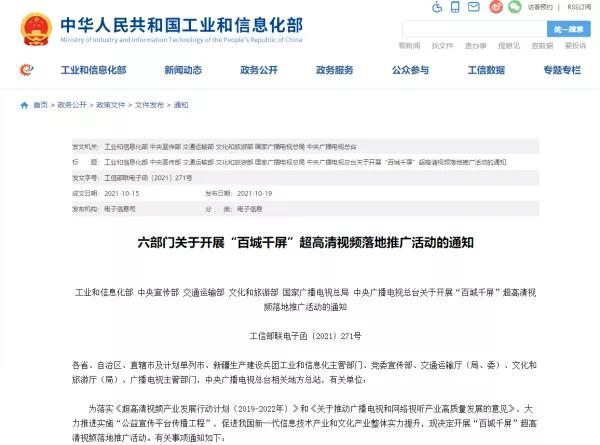 根据2021年10月15日,中央宣传部、工信部等六部委联合下发的通知,支持有条件的城市设立超高清公共大屏,充分发挥时事政策宣传、公益发布和弘扬社会主义核心价值观主阵地、主渠道、主力军作用,弘扬民族精神,呈现中国文化,提升超高清视频产业的渗透性。