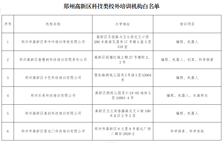 为巩固深化“双减”工作,进一步规范科技类校外培训机构的监督管理,营造良好的校外培训环境,现将郑州高新区已取得办学同意书的科技类校外培训机构名单正式面向社会公布(见下图)。本名单实行动态管理,不定期进行更新。