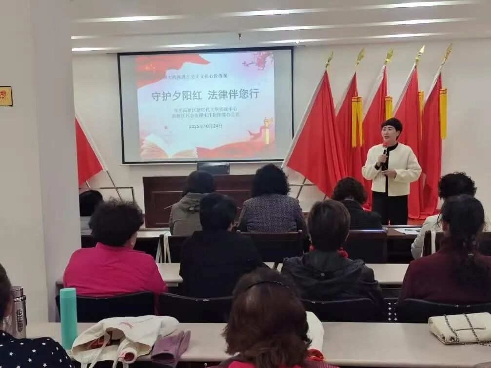 丹桂飘香,又迎重阳。10月24日上午,高新区新时代文明实践中心邀请省级宣讲师赵卫萍律师,到高新区开展"守护夕阳红,法律伴您行"主题宣讲活动,进一步推动辖区精神文明建设工作,让新时代文明实践活动深入群众生活。