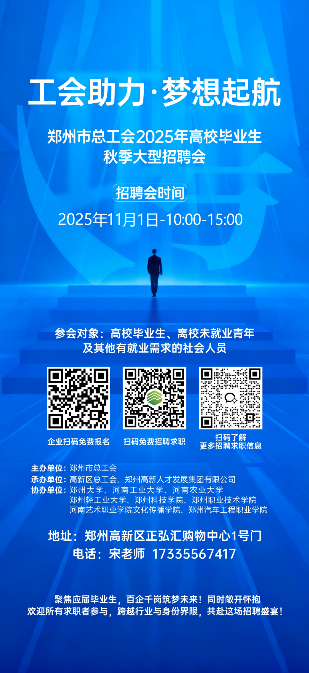 为深入贯彻落实党中央、国务院关于促进高校毕业生就业的决策部署,充分发挥工会组织服务职工、助力就业的桥梁纽带作用,进一步联动各级工会力量搭建高校毕业生与优质用人单位的高效对接平台,郑州市总工会定于2025年11月1日(周六)举办“工会助力·梦想起航”郑州市总工会2025年高校毕业生秋季大型招聘会。