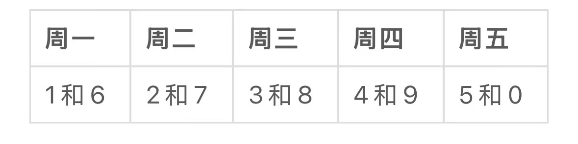 限行规定:按机动车号牌(含临时号牌和外地号牌)最后一位阿拉伯数字(尾数为字母的,以末位数字为准),工作日每天限行两个号。