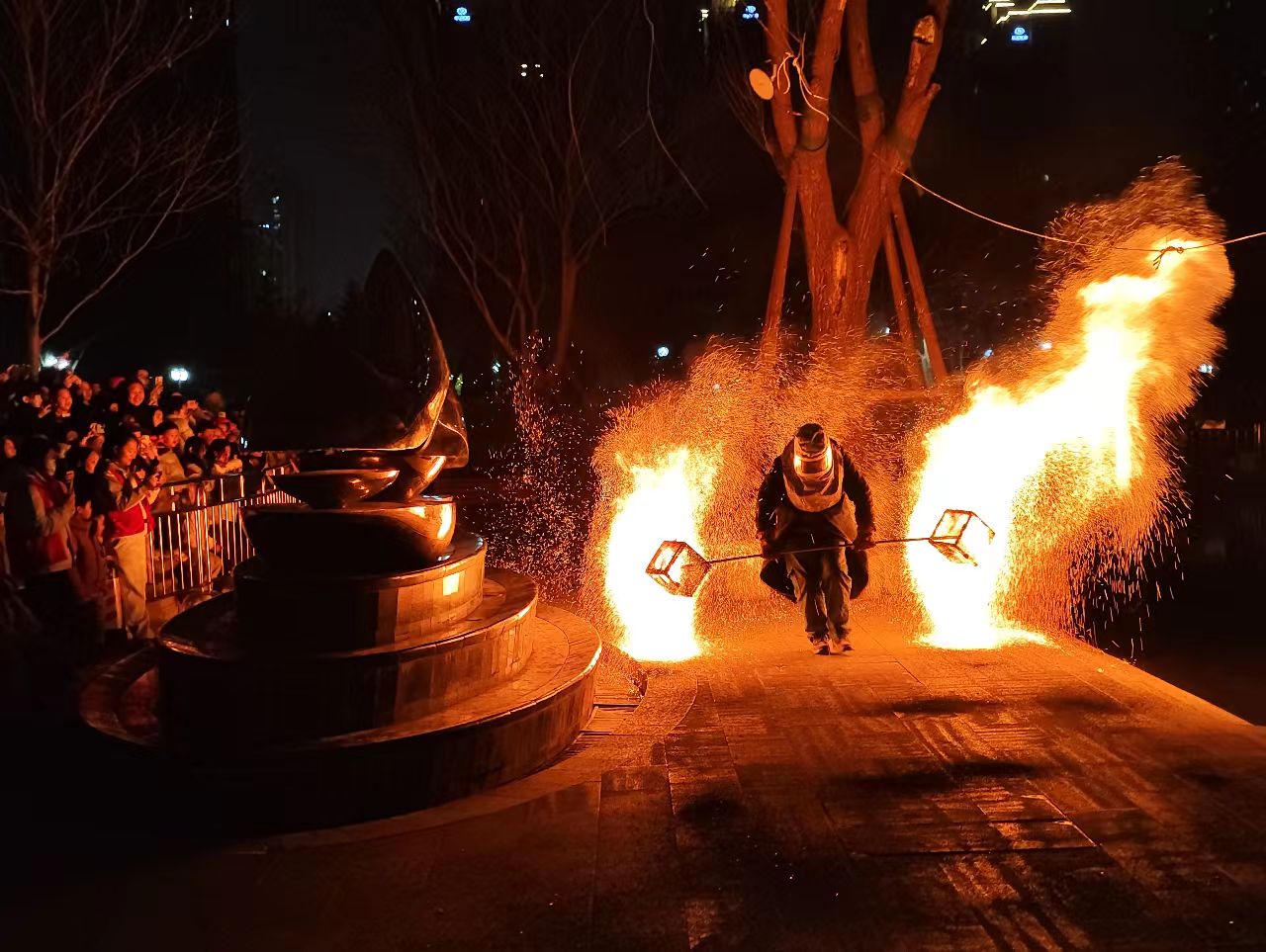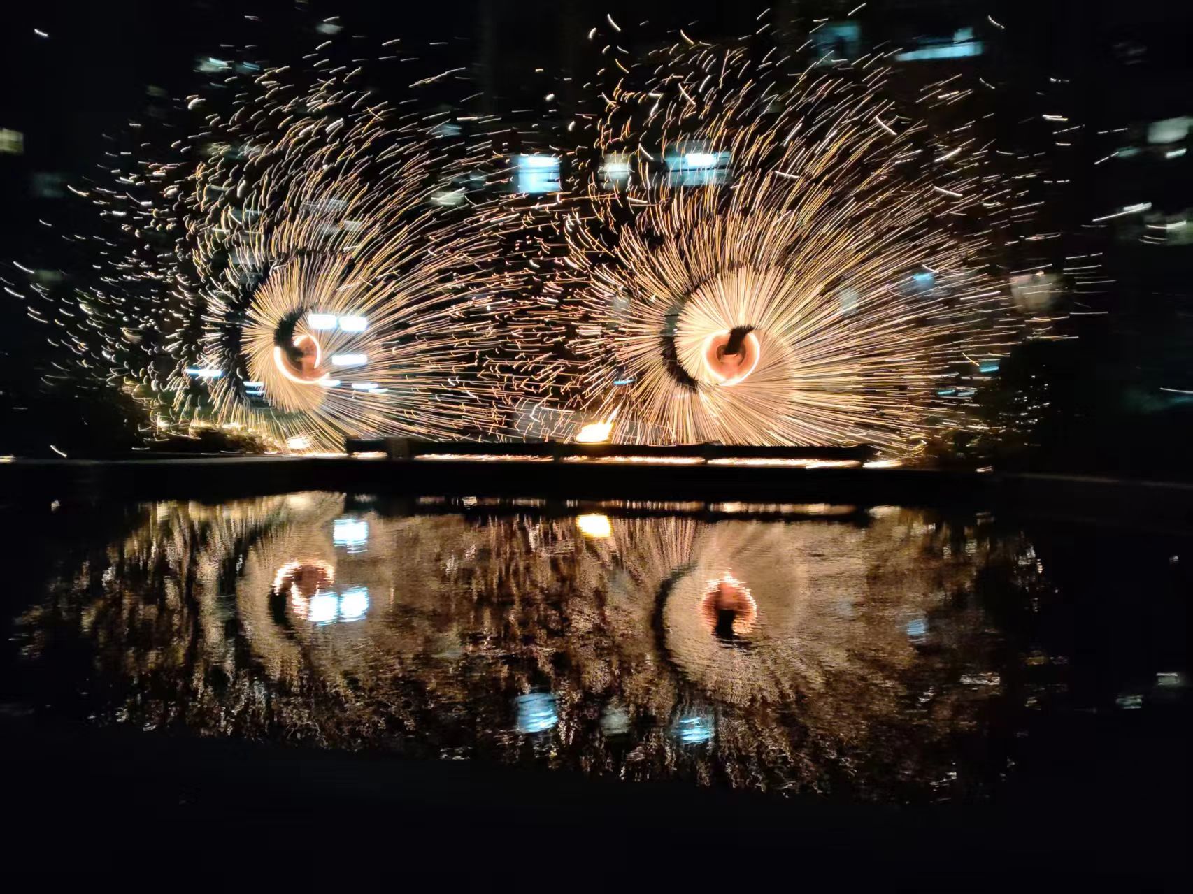 夜幕降临,整场活动迎来最震撼的非遗铁花表演。艺人挥舞火壶,划出金色流星;旋转风火轮,旋起炫目光焰。当1600℃的铁水被奋力抛起,再经木板猛力击打,“铁树银花不夜天”的绝美盛景骤然点亮夜空。金色火花如流星雨般洒落,映亮每张笑脸。业主们纷纷举起手机拍摄记录,定格这难得的团圆时刻。来自河南周口的李先生感慨道:“平时工作繁忙,与邻居碰面甚少,没想到返乡前能在家门口欣赏到如此精彩的非遗表演,还能和街坊们热热闹闹聚一场,实在惊喜!”