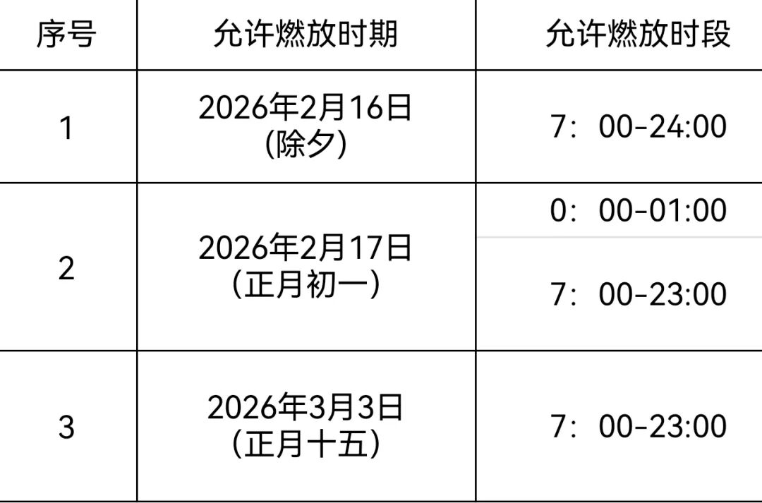 (二)2026年春节期间烟花爆竹允许燃放时间如下: