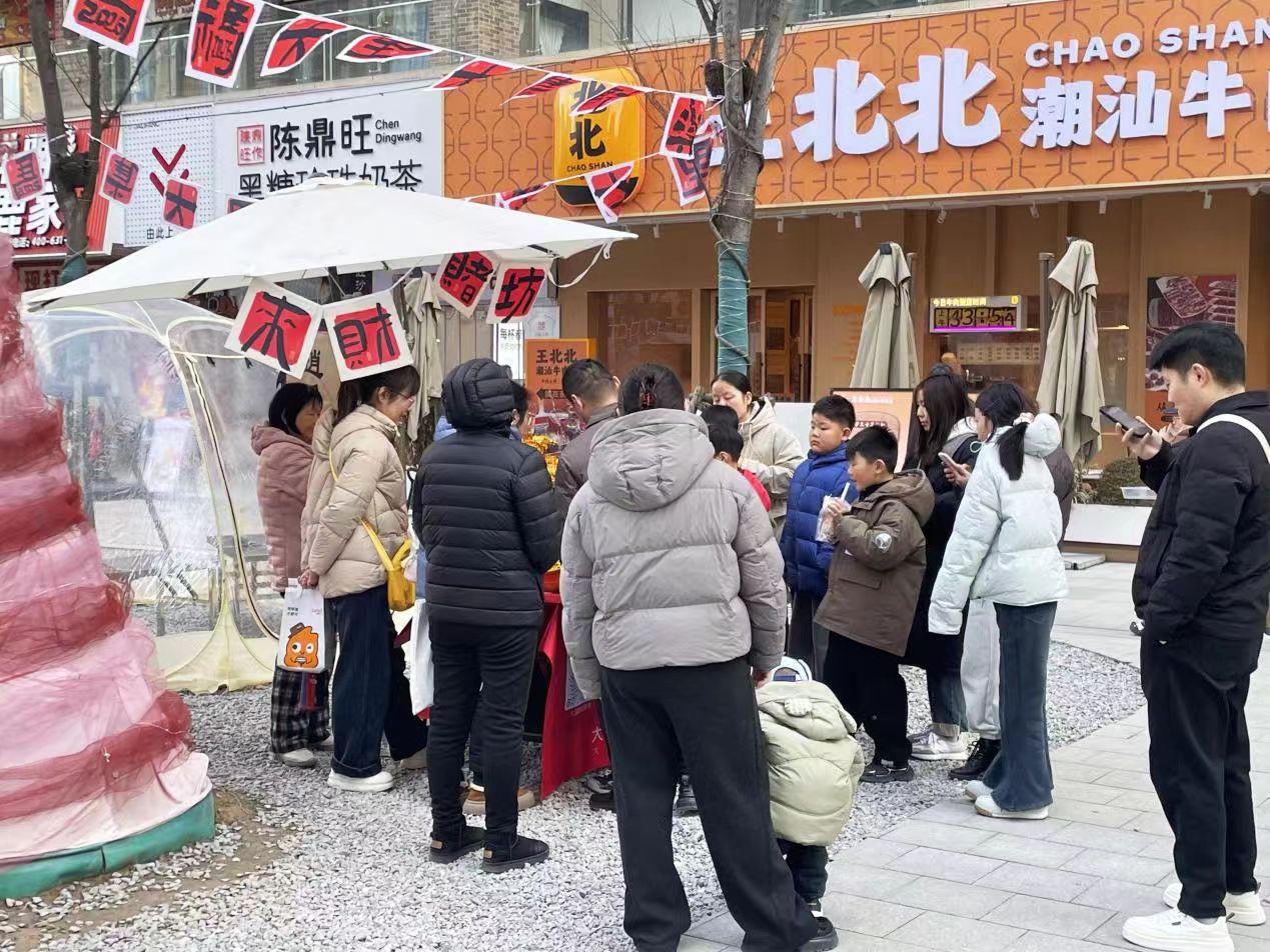 作为青年集聚潮流新地标,大里坊推出大里大集主题活动,特色市集摊位营造浓郁烟火年味。同时设置财神NPC互动点位,“天机泄露处”“来财赌坊”“小院许愿”等沉浸式玩法,让顾客边逛边玩赢银票,参与感拉满。正月初五,财神现场派发红包,为市民送上专属财运祝福,将节日氛围推向高潮。据统计,2026年2月15日–23日,大里坊总体客流量超5万人次,总销售额同比增长233%。