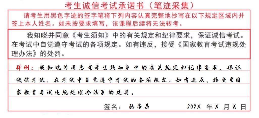 1.落实笔迹信息采集要求。考生应在答题卡指定区域完整抄写《考生诚信考试承诺书》并签名(抄写样例如下图),省教育考试院将采集此处的抄写内容作为考生笔迹信息,并随课程成绩记入考生考籍档案。