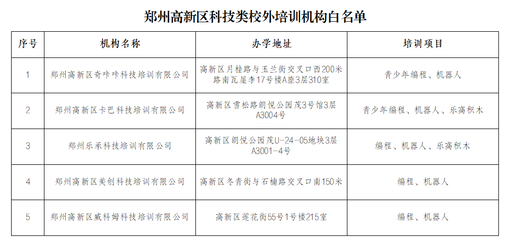 根据《河南省科技类校外培训机构设置标准和管理指南(试行)》《郑州市科技类校外培训机构管理办法》《郑州市科学技术局关于郑州市科技类校外培训机构年检工作的通知》有关要求,进一步规范科技类校外培训机构监督管理,营造良好的校外培训环境,现将郑州高新区科技类校外培训机构“白名单”公布如下。本名单实行动态管理,不定期更新。